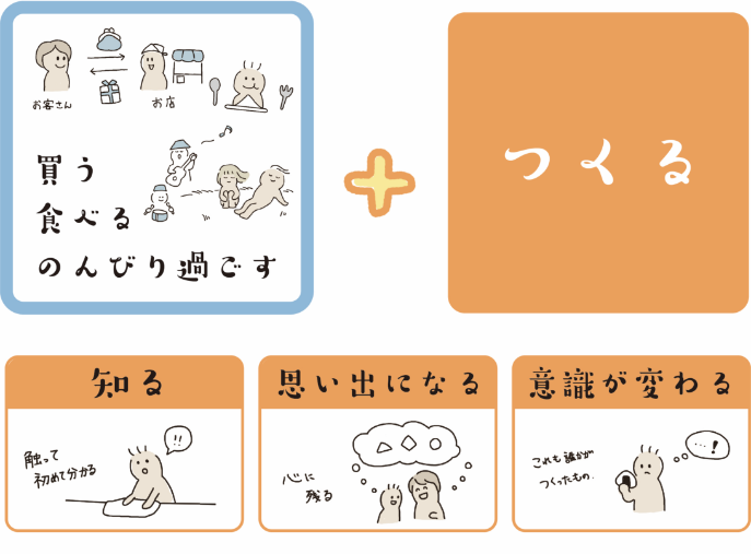 マルシェア実では、 本来のマルシェの「食べる」「買う」 「のんびり過ごす」に加えて 「つくる」を体験することができます。 学生・つくり手・くらし手の全員がつながり、 つくる楽しみや難しさを感じることで、 これからの暮らしが豊かになればと 考えます。