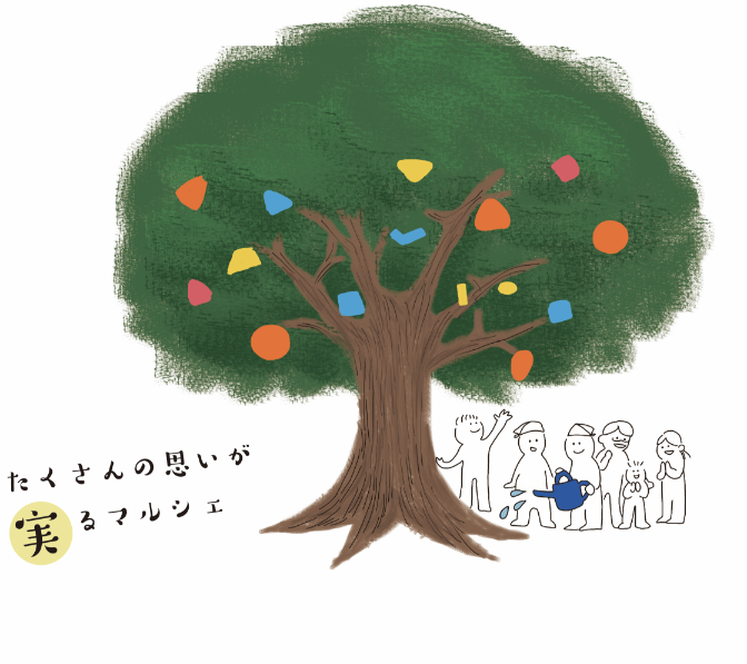 マルシェア実とは… 2015年から成安造形大学で続くマルシェです。 過去3年間「種・芽・菜」と少しずつ 育てられてきた1つの木に、 この度『マルシェア実』で生まれる 様々な思いや発見がそれぞれの色や 形にたくさん実り、より豊かな生活に 繋がっていくことを目指します。 また、この実が土に返ったとき、新たな種として これからも開催されるマルシェに繋がっていくようにと いう思いを込めて"実"とつけました。